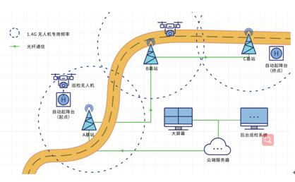 高速公路沿線部署多個地面基站,各地面基站與監控中心通過光纖相連。無人機沿高速公路巡檢,到達某一基站無線覆蓋區域時,巡檢視頻圖像通過該基站回傳到指揮中心;無人機飛到其他基站覆蓋區域時自動無縫切換傳輸路徑,切換過程中數據不丟失。