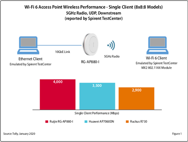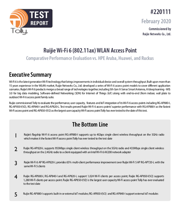 近日,Tolly Group發布《銳捷Wi-Fi 6 (802.11ax)無線接入點測試評估報告》(后文簡稱《報告》)。報告指出,“銳捷Wi-Fi 6無線接入點RG-AP880-I在5GHz頻段支持高達4Gbps的單用戶吞吐量,是迄今為止Tolly測試過的最快的Wi-Fi接入點;銳捷Wi-Fi 6無線接入點RG-AP850-I(V2)可支持1,280個Wi-Fi客戶端,是迄今為止Tolly評估過的具備最大用戶容量的Wi-Fi接入點。”