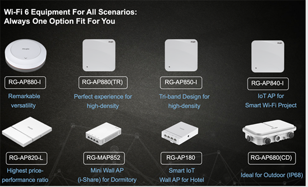 Wi-Fi 6作為最新一代的無線技術,可改善單個設備的性能和整個系統的吞吐量。銳捷Wi-Fi 6在此基礎上,在射頻設計、業務對焦和體驗優化能力三個方面持續精進,推出全場景Wi-Fi 6產品系列共10款產品,覆蓋面板、智分、放裝、高密和室外等多個類型,讓無線網絡可以真正承載各個場景的關鍵業務,為客戶建設一張未來五年內始終保持領先的無線網絡。