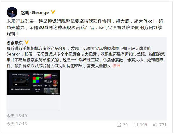 榮耀總裁趙明也轉發該微博表示,未來行業發展,越是頂級旗艦越是要堅持軟硬件協同,超大底,超大Pixel,超感光能力,榮耀會沿著系統協同的方向繼續深耕。