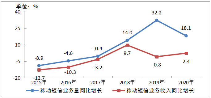飛象網(wǎng)訊(馬秋月/文)雖然個人短信被IM軟件碾壓,但短信并未死,甚至呈現(xiàn)“水下的繁榮”現(xiàn)象。根據(jù)工信部公布的數(shù)據(jù)顯示:2020年,全國移動短信業(yè)務(wù)量比上年增長18.1%,增速較上年下降14.1%;移動短信業(yè)務(wù)收入比上年增長2.4%,移動短信業(yè)務(wù)量收增速差從上年的33%下降至15.7%。