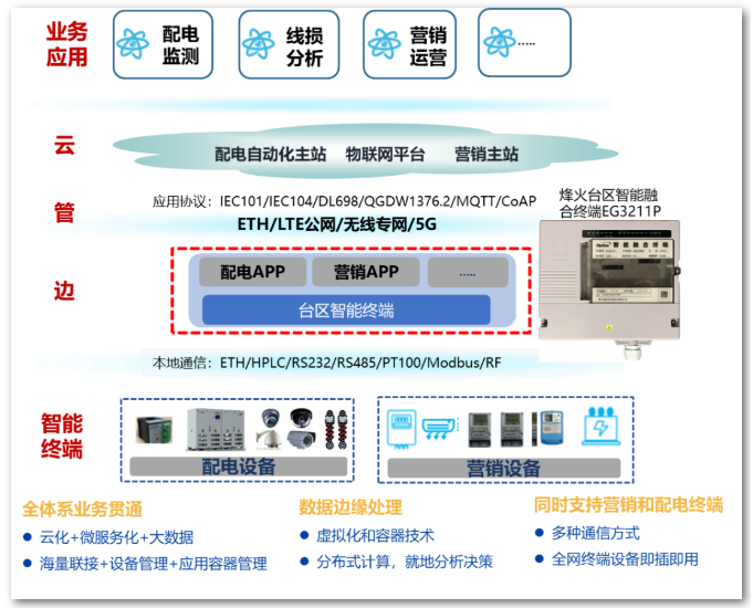 當前,為解決低壓配電網中長期存在配電臺區狀態感知難、線路運維效率低、用戶需求側管理混亂的痛點,烽火積極跟進國網需求,按照智慧電力物聯網“云-管-邊-端”的整體架構,推出臺區智能終端產品,即定位為配電自動化邊緣側設備。遠程上主要通過以太網或廣域無線網絡連接到物聯管理平臺、營銷主站、配電自動化主站或其他業務系統;本地則通過無線通信網絡、有線網絡支持各協議類型、各業務終端和傳感器的即插、即連、即用,實現感知層的通信匯聚、邊緣計算和區域自治。