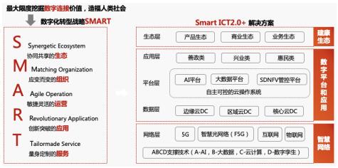 各行業(yè)各企業(yè)紛紛投身到數(shù)字化轉(zhuǎn)型的實踐中。例如,基于“最大限度挖掘數(shù)字連接價值造福人類社會”的愿景,烽火制訂了公司數(shù)字化轉(zhuǎn)型的戰(zhàn)略SMART,即協(xié)同共享的生態(tài)(Synergetic ecosystem)、因變而變的組織(Matching organization)、敏捷靈活的運營(Agile operation)、創(chuàng)新突破的應(yīng)用(Revolutionary application)、量身定制的服務(wù)(Tailormade service)。從SMART戰(zhàn)略再到Smart ICT2.0+完整解決方案,解決方案包括了智慧網(wǎng)絡(luò)、智慧平臺和應(yīng)用以及健康生態(tài)。