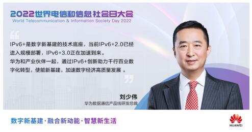 [中國,內蒙古,2022年5月17日] 在2022世界電信和信息社會日大會上,華為數據通信產品線研發總裁劉少偉在大會主論壇上發表了題為“‘IPv6+‘使能新基建,加速數字經濟高質量發展”的主題演講,分享了華為在政務、媒資、醫療和工業等領域的創新實踐,展望了“IPv6+”的美好未來。