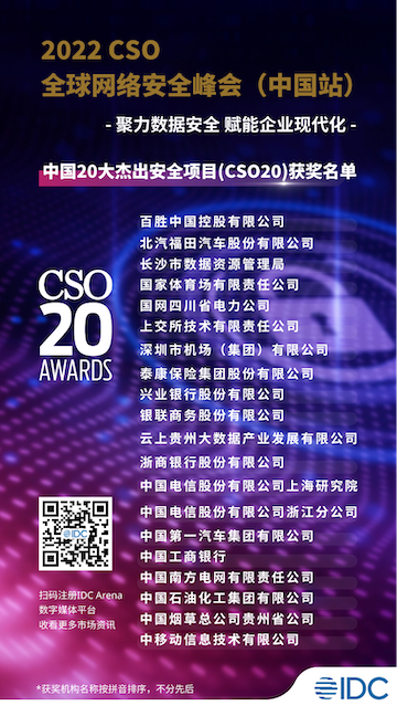 北京,2022年8月26日——IDC 2022 CSO全球網絡安全峰會(中國站)在上海隆重開幕,本屆大會以“聚力數據安全 賦能企業現代化”為主題,吸引了超過650位CIO、CSO以及CISO通過線上線下的形式參會。會上權威發布《IDC TechScape: 中國數據安全發展路線圖,2022》,并舉行了首屆IDC中國20大杰出安全項目和CSO名人堂頒獎典禮。