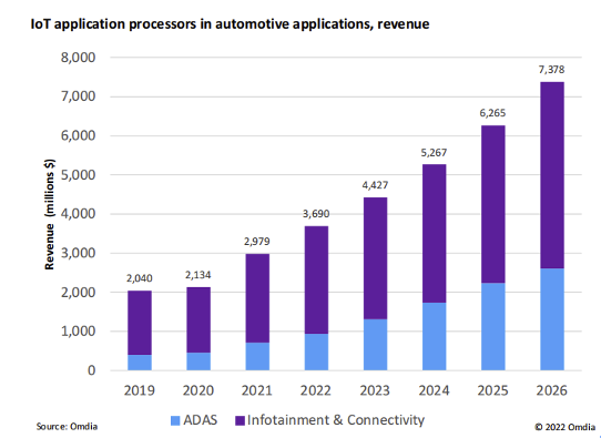 據(jù)Omdia預(yù)測,ADAS 應(yīng)用處理器的收入截止2026年將實現(xiàn) 30% 的復(fù)合增長率,而信息娛樂處理器的市場規(guī)模則將以每年略高于 16% 的速度增長。盡管ADAS以及自動駕駛近年來吸引了產(chǎn)業(yè)內(nèi)甚至廣大消費者的更多關(guān)注,但信息娛樂和連接仍然在引領(lǐng)汽車中應(yīng)用處理器市場的發(fā)展,Omdia也表示這一現(xiàn)象在可預(yù)見的未來會保持。