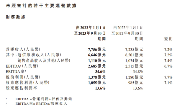 飛象網訊(致新/文)10月23日消息,中國移動近日公布2023年首3季度業績。期內,其經營業績表現良好,集團營運收入為7,756億元,同比增長7.2%;其中,通信服務收入為6,646億元,同比增長7.2%,銷售產品收入及其他為1,110億元,同比增長7.4%。2023年首3季度,集團股東應占利潤為1,055億元,同比增長7.1%,股東應占利潤率為13.6%。