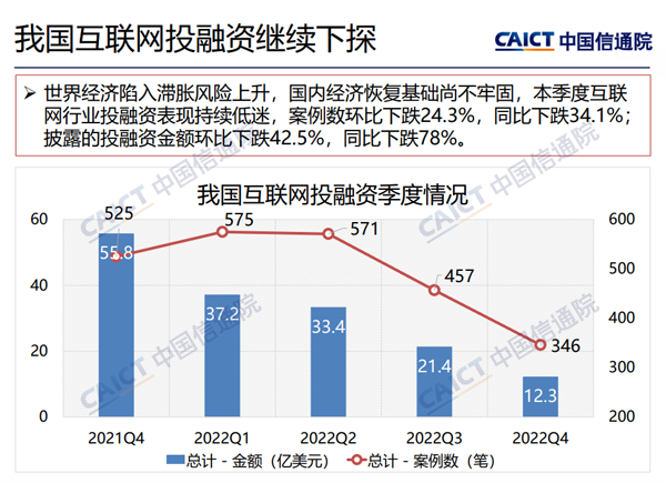 值得注意的是,2022年第四季度,我國互聯網投融資12.3億美元,投融資規模繼續下探,案例數環比下跌24.3%,同比下跌34.1%;披露的投融資金額環比下跌42.5%,同比下跌78%。