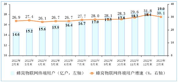 飛象網訊(馬秋月/文)今天工信部發布了2023年1-2月份通信業經濟運行情況,統計顯示:三大運營商發展蜂窩物聯網終端用戶19.05億戶,比上年末凈增6004萬戶,占移動網終端連接數(包括移動電話用戶和蜂窩物聯網終端用戶)的比重達52.9%。