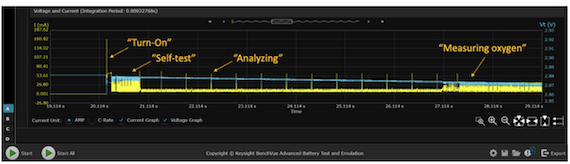 圖6:使用BV9210B/11B PathWave BenchVue高級電池測試和模擬軟件對脈搏血氧儀醫(yī)療物聯(lián)網(wǎng)設(shè)備的電流消耗情況進(jìn)行分析