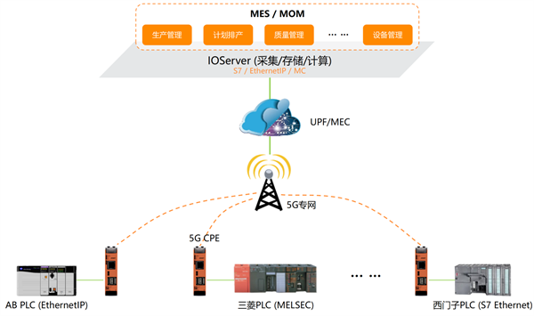 1.流量浪費。MEC云端IOServer周期性全量的數據采集,流量消耗過大。例如:現場單臺PLC@1000點/S的采集頻率,每月需要約50G的通訊流量,此時只要邊緣端設備具備數據采集、篩選、過濾、變化上傳等策略,就可以大幅度降低網絡流量開銷。這種做法基本沿襲傳統有線網絡的做法,在本地提供支持5G傳輸、具備IOServer系統功能的設備。