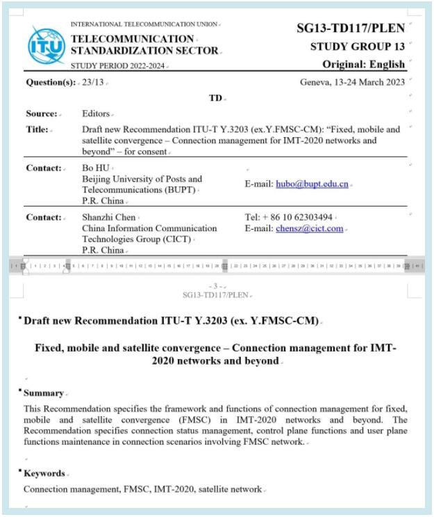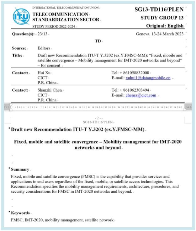 2023年3月,在剛剛結(jié)束的國(guó)際電信聯(lián)盟(ITU-T)SG13全體會(huì)議上,中國(guó)信科牽頭和主導(dǎo)制定的2項(xiàng)星地融合國(guó)際標(biāo)準(zhǔn):《Y.3202,F(xiàn)ixed, mobile and satellite convergence: Mobility management for IMT-2020 networks and beyond》(固定、移動(dòng)和衛(wèi)星融合:面向IMT-2020及其演進(jìn)網(wǎng)絡(luò)的移動(dòng)性管理)、《Y.3203,F(xiàn)ixed, mobile and satellite convergence: Connection management for IMT-2020 networks and beyond》(固定、移動(dòng)和衛(wèi)星融合:面向IMT-2020及其演進(jìn)網(wǎng)絡(luò)的連接管理)獲批結(jié)項(xiàng),實(shí)現(xiàn)了星地融合通信關(guān)鍵技術(shù)在標(biāo)準(zhǔn)化方面的突破,為星地融合通信的技術(shù)研究和標(biāo)準(zhǔn)體系構(gòu)建奠定了堅(jiān)實(shí)基礎(chǔ),標(biāo)志著中國(guó)信科在星地融合“5G兼容、6G融合”取得的又一重大成果。