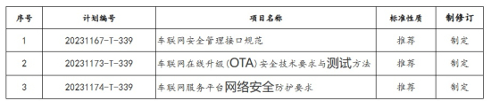 2023年12月,國家標準化管理委員會下達了2023年第三批推薦性國家標準計劃,全國通信標準化技術(shù)委員會提交的三項重要車聯(lián)網(wǎng)安全領(lǐng)域國家標準項目正式獲批立項。
