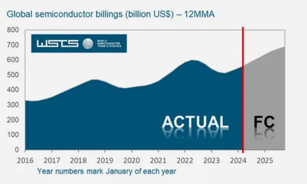隨著全球人工智能(AI)和高性能運算(HPC)需求的增長,以及智能手機、個人計算機、服務器、汽車等市場的需求回暖,半導體產業正迎來新一輪增長浪潮。6月份,世界半導體貿易統計組織(WSTS)上調了對全球半導體市場的預期,預計2024年將實現16%的增長,市值估值達到6110億美元。據悉,這一增長主要得益于過去兩個季度的強勁表現,尤其是在計算終端市場。與之形成對比的是WSTS在今年初曾預測2024年全球半導體市場的同比增長率為13.1%,總規模至5883.6億美元。無獨有偶,WSTS更是預計2024年和2025年市場都將實現強勁增長。