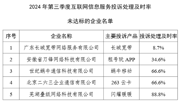 在互聯網信息服務投訴方面,2024年第三季度,互聯網信息服務投訴平臺收到的互聯網用戶投訴中,服務功能類投訴占比49.8%,客服渠道類投訴占比19.7%,個人信息保護類投訴占比17.4%,其他類投訴占比13.1%。在接入平臺的176家互聯網企業中,廣東長城寬帶等5家企業投訴處理及時率較低(詳見附件2),工信部已督促相關企業妥善處理用戶反映的問題。