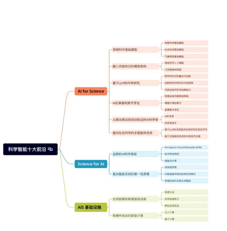 其中,AI for Science的前沿方向包括垂直領(lǐng)域科學(xué)大模型、融入先驗(yàn)知識的AI模型、基于LLM模型的科學(xué)研究、從提出假設(shè)到自動(dòng)驗(yàn)證的AI科學(xué)家,以及復(fù)雜世界的多智能體建模;Science for AI的前沿方向則覆蓋了物理世界的第一性原理和科學(xué)啟發(fā)的可解釋AI新架構(gòu);科學(xué)智能基礎(chǔ)設(shè)施前沿方向包括合成數(shù)據(jù)和新型智能計(jì)算。展望未來,面向可信可解釋的科學(xué)世界模型和上述九個(gè)方向共同構(gòu)成科學(xué)智能十大前沿。