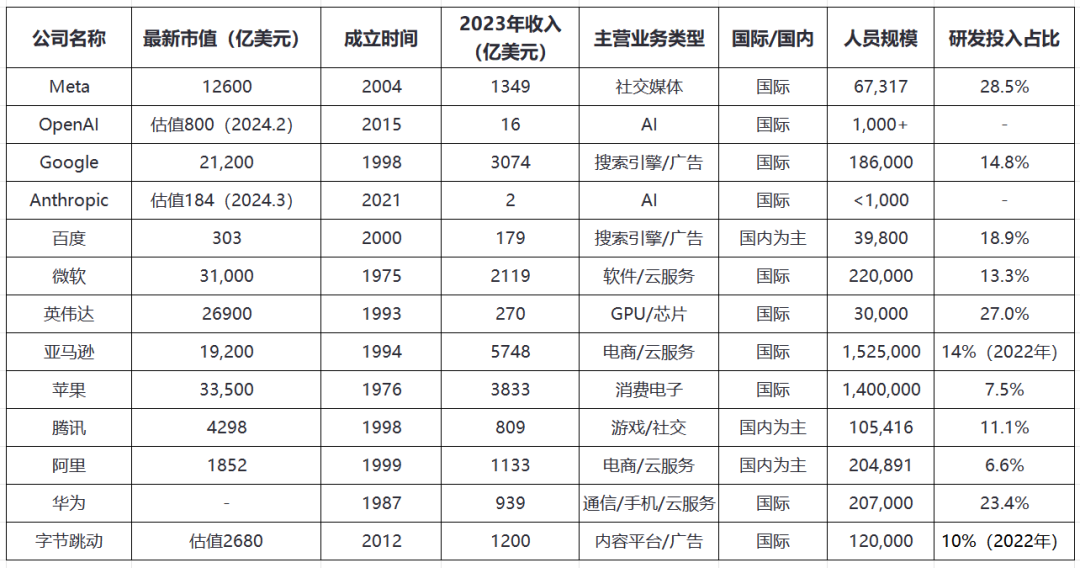 一是市值或估值都很高,絕大部分在數千億到數萬億美元之間;二是大都為成立時間較早的科技巨頭;三是收入規(guī)模大,從數百億到數千億(兩家創(chuàng)企OpenAl、Anthropic除外); 四是主營業(yè)務以互聯(lián)網服務、云計算和軟硬件服務為主;五是人員規(guī)模大,基本都在數萬到超百萬(兩家創(chuàng)企除外);六是研發(fā)投入占比高,Meta、英偉達、華為研發(fā)投入占比超20%;百度、谷歌、微軟、騰訊超10%。