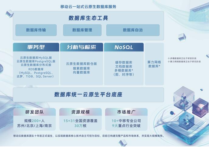 移動云圍繞“云原生+全場景+自主可控”這一核心定位打造一站式產(chǎn)品家族,具備事務(wù)型、分析與檢索型、NoSQL等多種類型的數(shù)據(jù)庫服務(wù)能力。同時,針對算網(wǎng)融合發(fā)展趨勢,移動云還啟動了新一代算力網(wǎng)絡(luò)數(shù)據(jù)庫的規(guī)劃設(shè)計(jì)。