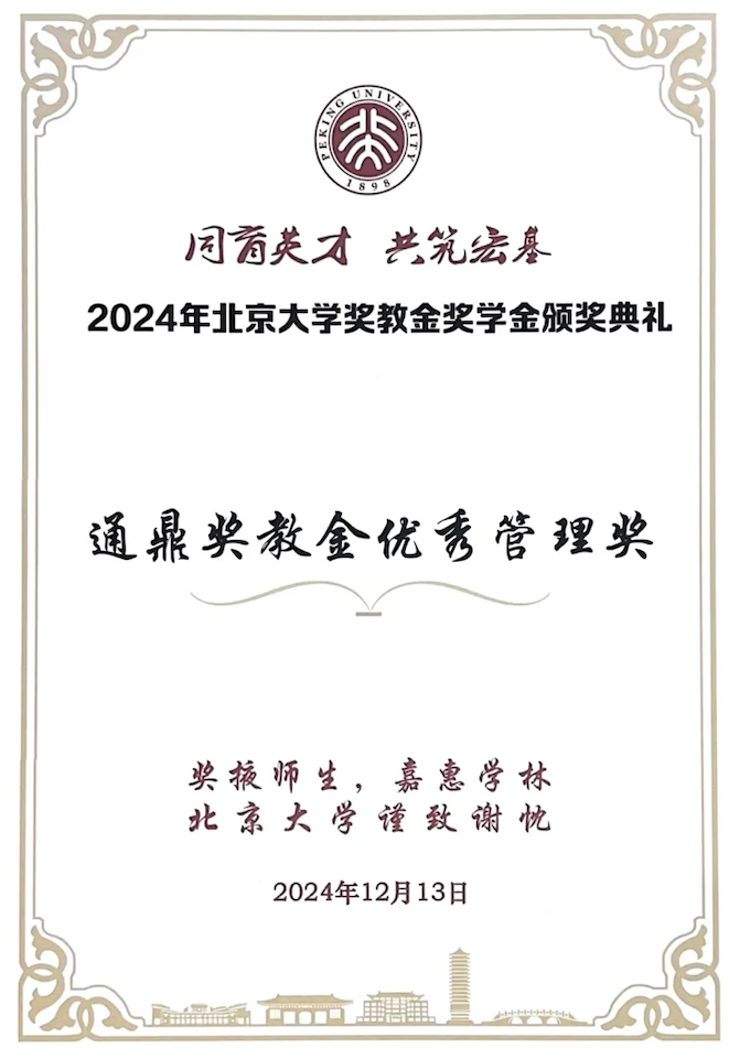 據悉,通鼎集團于2023年捐贈1800萬元設置“北京大學通鼎教育發展基金”,旨在助力北大建設“有中國特色的世界一流大學”,支持學校師資隊伍建設和學科發展,通過“通鼎獎教金”,建設更好的師資隊伍、培養更多德才兼備的優秀人才、深化校企合作、為國家經濟社會發展作出力所能及的貢獻。