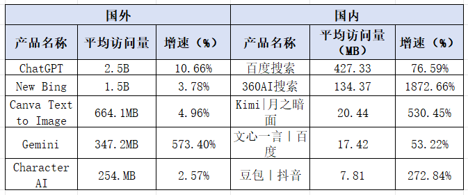 4.【十大產(chǎn)品】篩選規(guī)則:AI產(chǎn)品榜單的國內(nèi)和全球應(yīng)用訪問量和增速相結(jié)合。全球前五的產(chǎn)品分別是ChatGPT、New Bing、Text to Image、Gemini、Character AI;國內(nèi)前五的產(chǎn)品分別是百度搜索、360AI搜索、Kimi|月之暗面、文心一言|百度、豆包|抖音,與《天翼智庫》往期大模型周報(bào)和AI投資風(fēng)向標(biāo)做重疊交叉,從中篩選出相關(guān)文章。