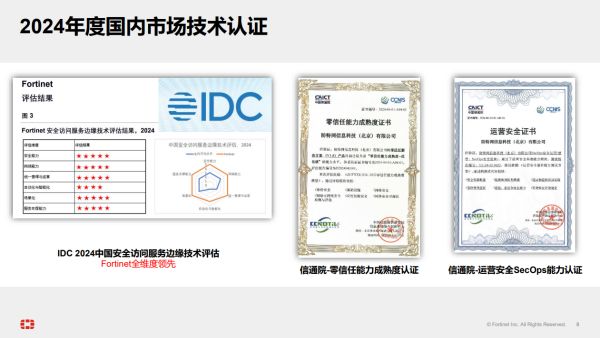 2024年度,Fortinet中國區在業務拓展上也取得顯著成就,不僅助力C2G/G2C業務蓬勃發展,銷售業績持續增長,更在SecOps產品上實現了40%+的銷售額占比增長,統一SASE產品增長20%+,OT方案增長45%+,SD-WAN方案增長12%+。此外,Fortinet榮獲IDC中國安全訪問服務邊緣技術評估全維度領先,以及信通院零信任與運營安全SecOps能力認證。