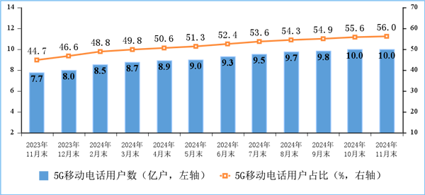 飛象網(wǎng)訊(致新/文)12月25日消息,根據(jù)工信部近日公布的《2024年前11個月通信業(yè)經(jīng)濟(jì)運(yùn)行情況》顯示,截至11月末,三家基礎(chǔ)電信企業(yè)及中國廣電的移動電話用戶總數(shù)達(dá)17.9億戶,比上年末凈增4682萬戶。其中,5G移動電話用戶達(dá)10.02億戶,比上年末凈增1.8億戶,占移動電話用戶的56%。
