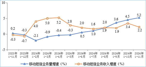 在電信業(yè)務(wù)使用情況上,電話通話量持續(xù)下滑,移動短信業(yè)務(wù)量小幅提升。2024年前11個月,移動電話去話通話時長完成2萬億分鐘,同比下降4.9%;固定電話主叫通話時長完成720.6億分鐘,同比下降2.2%。前11個月,全國移動短信業(yè)務(wù)量同比增長5.2%;移動短信業(yè)務(wù)收入同比增長2.2%。