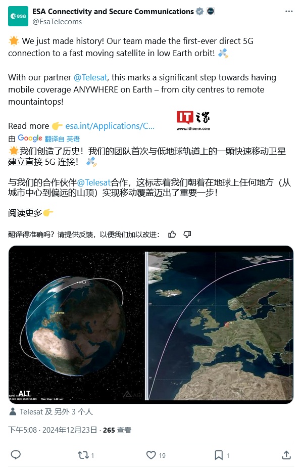歐空局(ESA)于 12 月 23 日發(fā)布博文,攜手加拿大衛(wèi)星通信公司 Telesat,成功實(shí)現(xiàn)全球首個(gè)基于低地球軌道(LEO)的 3GPP 非地面網(wǎng)絡(luò)(NTN)連接,標(biāo)志著衛(wèi)星通信技術(shù)的重大突破。