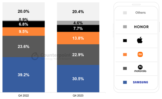 從季度來看,拉美地區2023年第四季度智能手機出貨量同比增長4.2%,連續兩個季度錄得增幅,在品牌廠商中,三星以30.5%的份額蟬聯第一,低于2022年第四季度的39.2%,蘋果公司以7.7%的市場份額創下最佳季度業績,榮耀以4.6%的份額躍居第五,創下歷史新高。