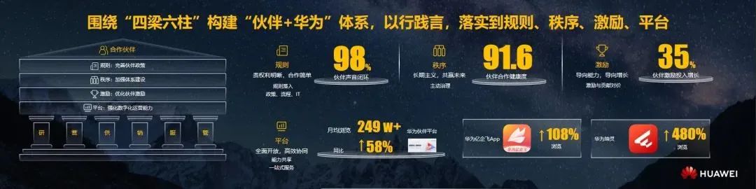 首先,我們先來(lái)回顧一下去年所提出的“伙伴+華為”體系,是圍繞“四梁六柱”來(lái)進(jìn)行構(gòu)建的。