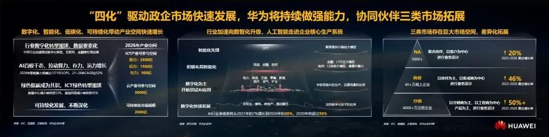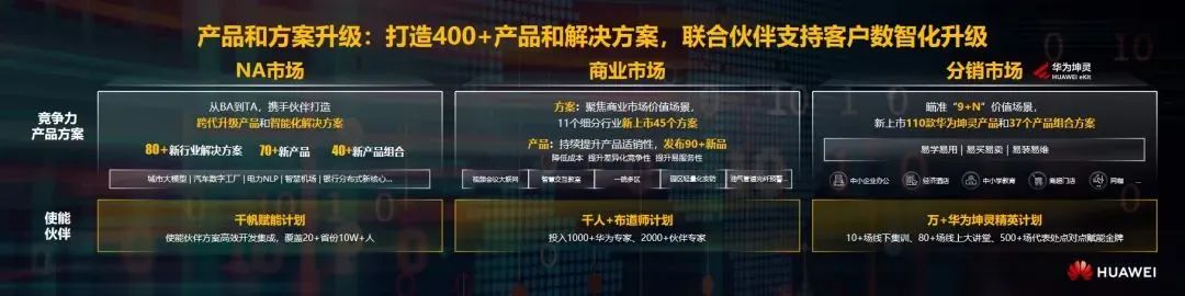 因此,我們要做全面的升級(jí),一是產(chǎn)品和方案的升級(jí)。今年將進(jìn)一步推出400+的產(chǎn)品和解決方案,聯(lián)合伙伴支持客戶的數(shù)智化升級(jí);對(duì)于NA市場(chǎng),我們有80個(gè)行業(yè)解決方案,70個(gè)新產(chǎn)品,40+的產(chǎn)品組合。對(duì)于商業(yè)市場(chǎng),我們進(jìn)行了行業(yè)細(xì)分,聚焦11個(gè)行業(yè),新上市45個(gè)方案,發(fā)布90+的產(chǎn)品;對(duì)于分銷市場(chǎng),瞄準(zhǔn)“9+N”的價(jià)值場(chǎng)景,將上市110款華為坤靈產(chǎn)品和37個(gè)小而美的產(chǎn)品組合。