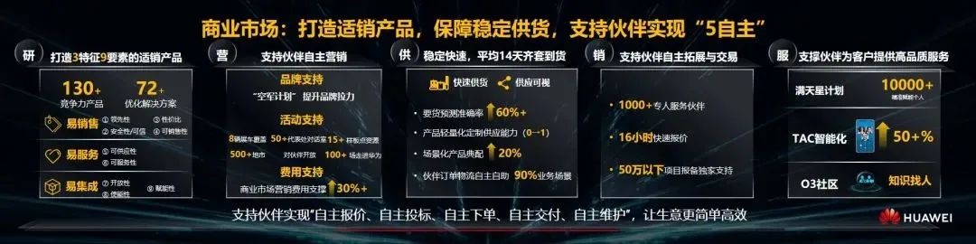 與NA市場(chǎng)不同,商業(yè)市場(chǎng)我們重點(diǎn)是通過(guò)研發(fā)打造適合于商業(yè)市場(chǎng)的適銷產(chǎn)品,保障供貨的穩(wěn)定(平均控制在14天以內(nèi)),更重要的是支持伙伴能夠做到“5自主”,即自主報(bào)價(jià)、自主投標(biāo)、自主下單、自主交付、自主維護(hù),讓伙伴做生意更容易、更簡(jiǎn)單。為此,在“研”方面,我們圍繞伙伴訴求打造產(chǎn)品方案;在“營(yíng)”方面,通過(guò)“空軍計(jì)劃”支持商業(yè)市場(chǎng)做好品牌拉力,并充分開放我們所有的營(yíng)銷資源,包括華為公司總部、15+個(gè)樣板點(diǎn),50+個(gè)代表處對(duì)話室,以及8輛展車等。