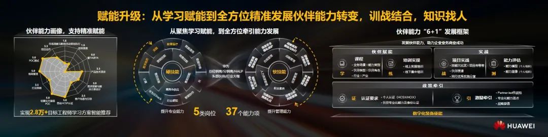 我們還構(gòu)建了合作伙伴能力“6+1”發(fā)展框架,從聚焦學(xué)習(xí)賦能到全方位牽引能力發(fā)展。面向合作伙伴售前、售后、銷售、商務(wù)、營(yíng)銷、管理者六類關(guān)鍵角色,通過(guò)“學(xué)、練、戰(zhàn)、測(cè)、認(rèn)、引”相結(jié)合,打造數(shù)字化裝備平臺(tái),持續(xù)提升伙伴關(guān)鍵角色軟硬技能,構(gòu)建合理人才梯隊(duì),實(shí)現(xiàn)華為與伙伴共同成長(zhǎng),助力伙伴、華為商業(yè)成功。