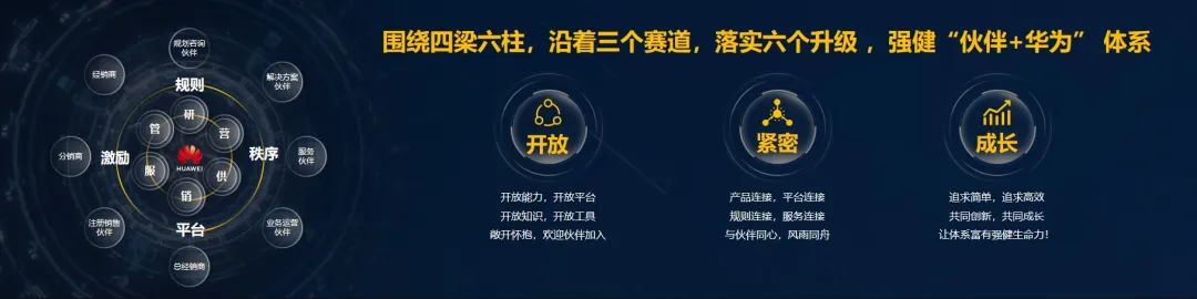 因此,我們圍繞著“四梁六柱”沿著三個(gè)賽道,落實(shí)六個(gè)升級(jí),這就是我們今年要做的事情。圍繞的“四梁六柱”,就是緊扣伙伴體系建設(shè)的底座和核心,即規(guī)則、秩序、激勵(lì)和平臺(tái),沿著NA、商業(yè)、分銷三類市場(chǎng)三個(gè)賽道,落實(shí)六個(gè)升級(jí),核心就是為了構(gòu)建一個(gè)富有生命力的、強(qiáng)健的“伙伴+華為”體系,這個(gè)體系將具備三大特征:開放、緊密、成長(zhǎng)。我們開放能力、平臺(tái)、工具及知識(shí);與伙伴共建平臺(tái),共建社區(qū),共建工具,形成產(chǎn)品平臺(tái)規(guī)則和服務(wù)的緊密連接,與伙伴同心,風(fēng)雨同舟;同時(shí)追求簡(jiǎn)單,進(jìn)一步地追求高效,用人工智能加持,共同創(chuàng)新,共同成長(zhǎng),讓體系具備生命力。讓我們的伙伴和華為形成一個(gè)有機(jī)的強(qiáng)大的生命體,最終讓客戶實(shí)現(xiàn)“數(shù)智世界,一觸即達(dá)”。