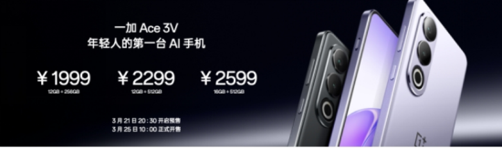 一加 Ace 3V 于 3 月 21 日 20:30 開啟預售, 3 月 25 日 10:00 正式開售,售價 1999 元起。發布會上,全新 TWS 耳機一加 Buds V 同步亮相,售價 179 元。
