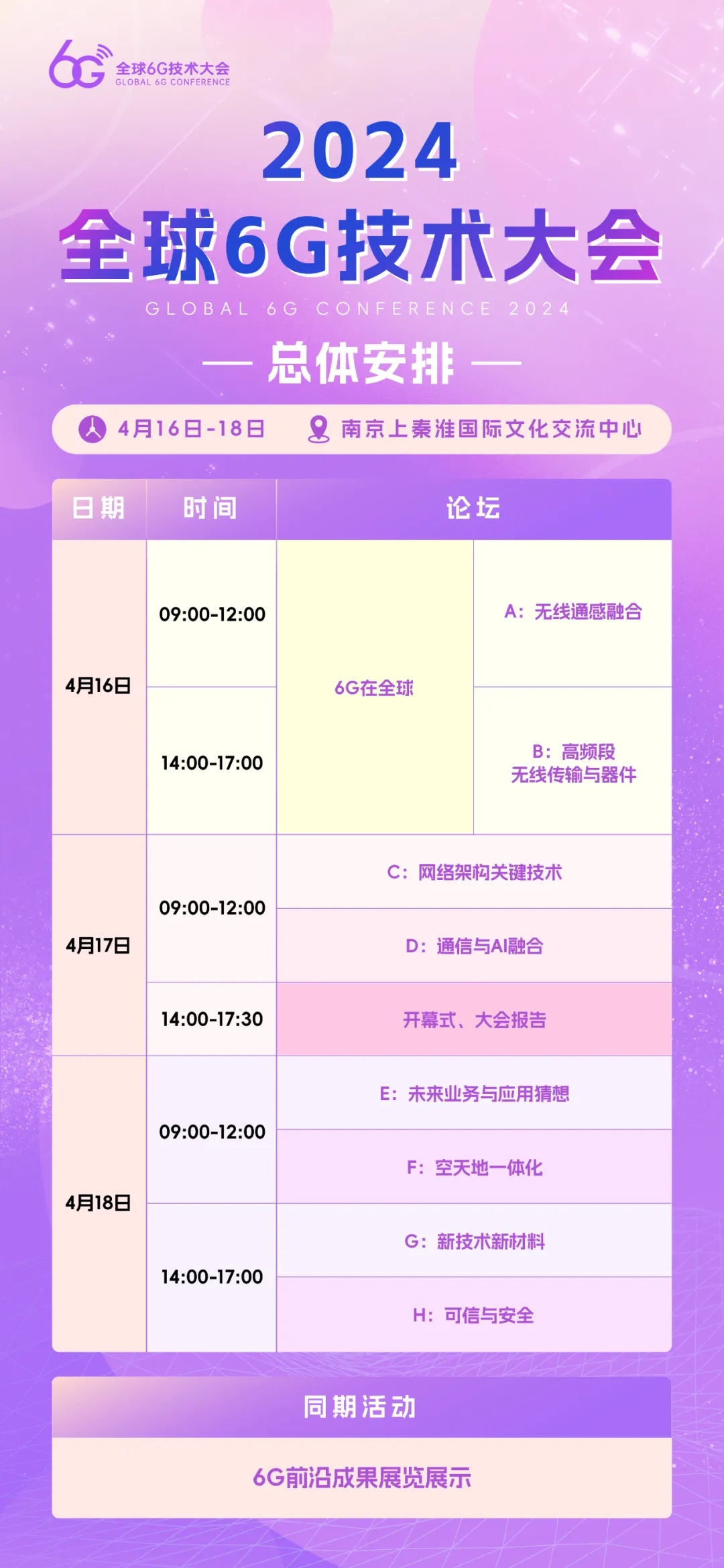 2024年4月16日至18日,由國家6G技術(shù)研發(fā)推進工作組和總體專家組指導(dǎo),由未來移動通信論壇、紫金山實驗室主辦的2024全球6G技術(shù)大會將在南京上秦淮國際文化交流中心召開!叭6G技術(shù)大會”是面向6G前沿領(lǐng)域的覆蓋廣泛、內(nèi)容全面的會議,迄今已連續(xù)舉辦三屆。本次大會以“創(chuàng)新預(yù)見6G未來”為主題,全球6G領(lǐng)域思想領(lǐng)袖和技術(shù)先鋒共聚金陵,圍繞6G愿景共識,一同探討6G前沿技術(shù)與應(yīng)用方向,旨在6G標(biāo)準(zhǔn)啟動前推動凝練全球共識。
