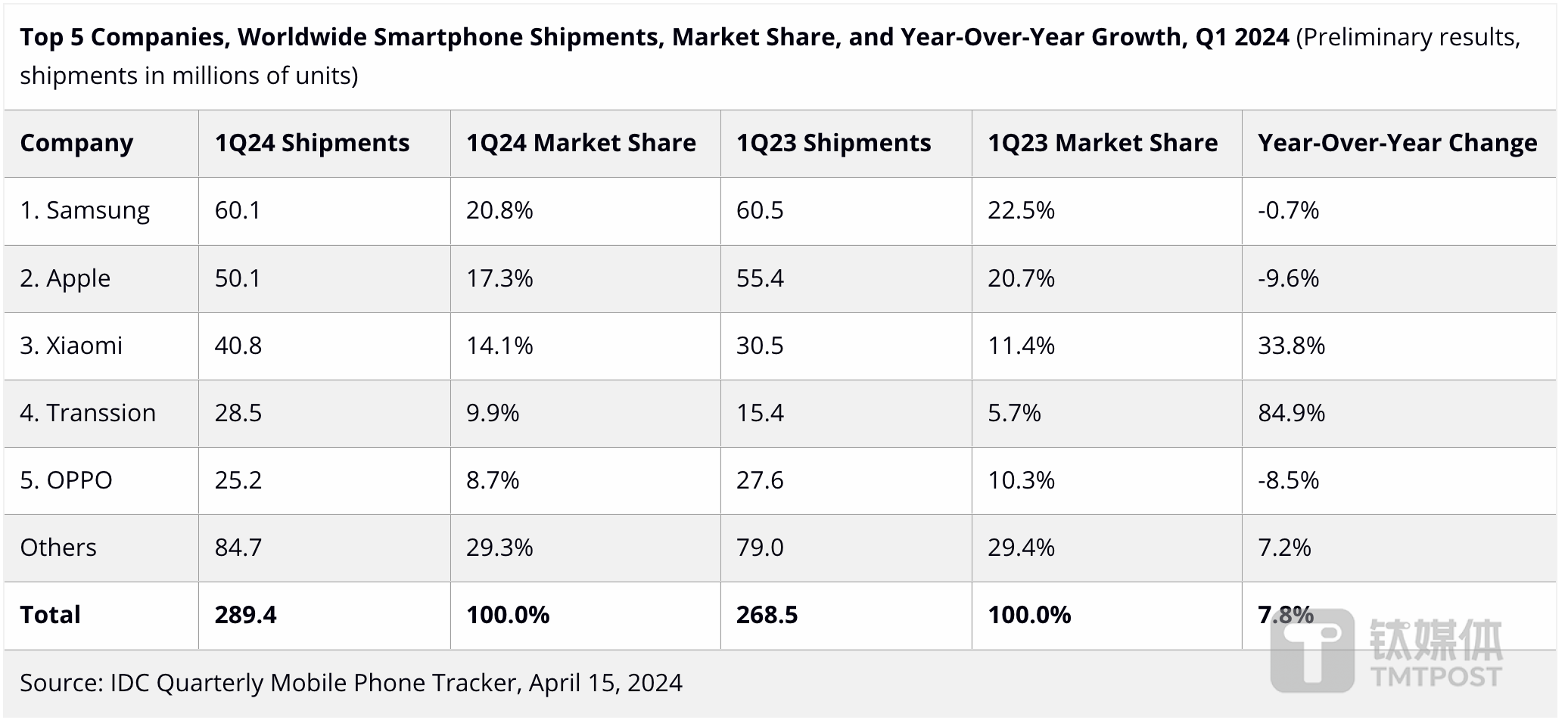 三星反超蘋果,傳音坐穩前五
