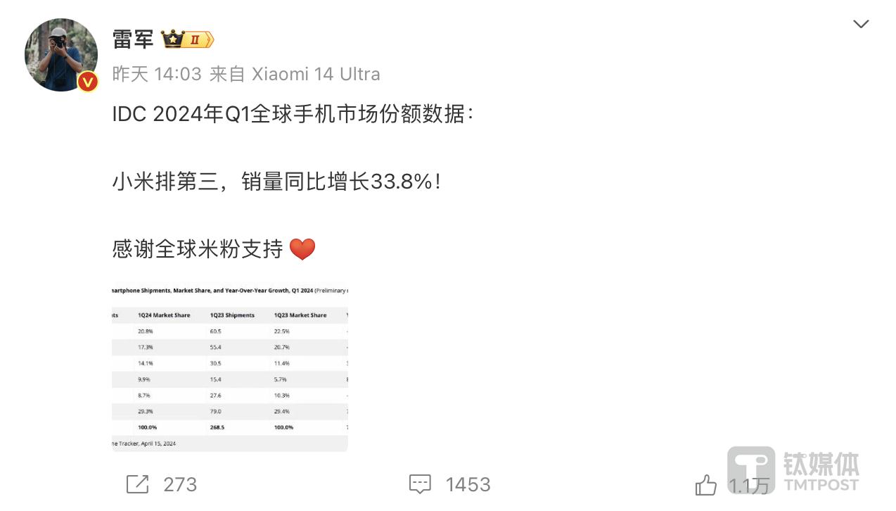 相比較蘋果的下滑,來自中國的小米和傳音則是分別以33.8%和84.9%的增速,成為前五名中唯二增長的品牌。其中,小米第三的排名比較穩固,但不同于去年同期,借助小米14系列的大賣以及走量機型紅米的助推,其與蘋果之間的份額差距已從9.3%降至3.2%。開年的優異表現,也讓全身心投入造車的雷軍發文慶祝,感謝米粉的支持。
