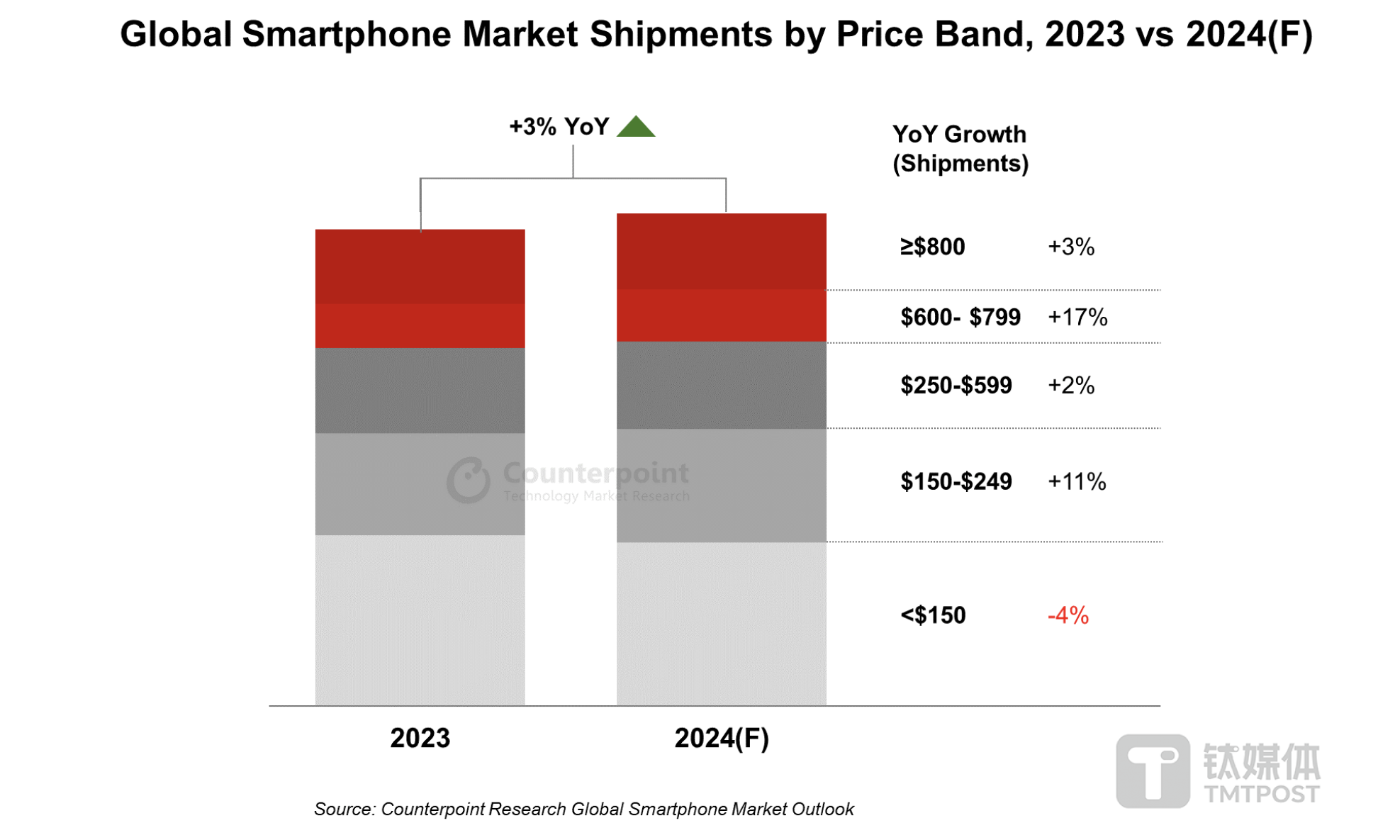 Counterpoint預估,2024年高端市場(600-799美元)將同比增長17%,蘋果和華為很可能引領高端市場的增長。其中,折疊屏的演進是一個刺激因素,而在AI的加持下,高端市場今年也有了更多的看點。