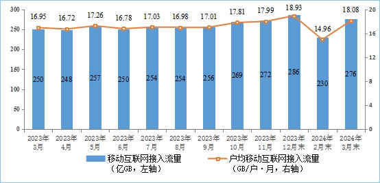飛象網訊(致新/文)4月23日消息,據工信部近日公布的《2024年一季度通信業經濟運行情況》顯示,一季度,移動互聯網累計流量達763.8億GB,同比增長14.3%,增速同比提升0.7個百分點。截至3月末,移動互聯網用戶數達15.33億戶,比上年末凈增838.1萬戶。3月當月戶均移動互聯網接入流量(DOU)達到18.08GB/戶·月,同比增長6.7%,比上年同期提升1.13GB/戶·月。