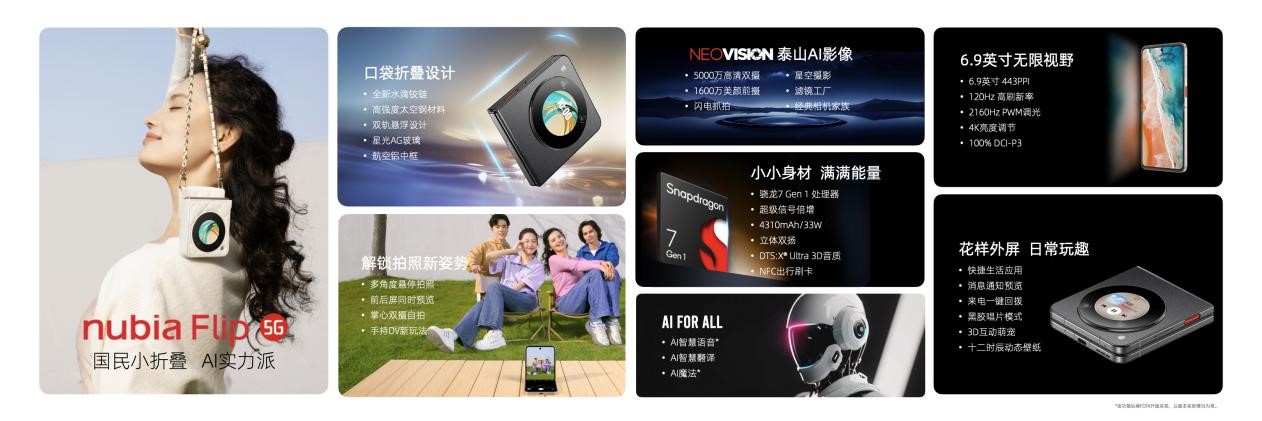 作為“AI實力派”,努比亞Flip支持全方位的AI體驗。AI智慧翻譯隨時解決出國旅行的語言難題,并且在外屏就能直接使用(相關功能后續通過FOTA升級實現),隨說隨譯。AI智慧語音作為基于AI大模型的全新智能助理,具備強大的語言理解和生成能力,不僅能進行自然語言對話聊天,知識問答,還能進行多種場景下的文字創作,如朋友圈文案、美食點評、翻譯創作、PPT框架等(相關功能后續通過FOTA升級實現)。此外,AI技術還被貫穿在新機整個系統當中,AI計算攝影、AI性能引擎、AI省電功能等,讓手機的使用體驗得到全方位提升。