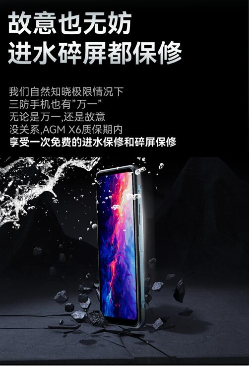 雖然AGM X6擁有卓越的三防性能,但是,在極限情況下,即便是三防手機也難以完全避免意外。因此,為了提供更全面的保障,AGM手機公司為每一位購買AGM X6的消費者,提供了為期一年的水損險和碎屏保險服務。