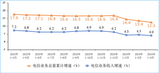 飛象網訊(致新/文)5月22日消息,工信部近日公布《2024年1—4月份通信業(yè)經濟運行情況》。2024年1—4月份,我國電信業(yè)務收入累計完成5924億元,同比增長4%。按照上年不變價計算的電信業(yè)務總量同比增長12.5%。