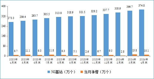 與此同時,5G網絡建設持續推進。截至2024年4月末,5G基站總數達374.8萬個,比上年末凈增37.2萬個,占移動基站總數的31.7%,占比較一季度提高1.1個百分點。