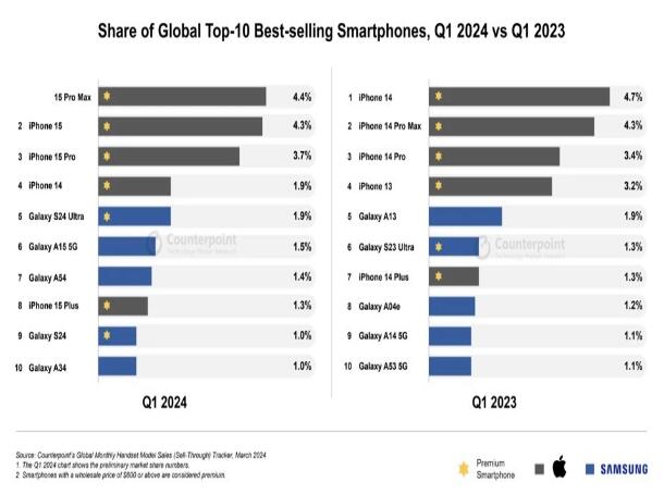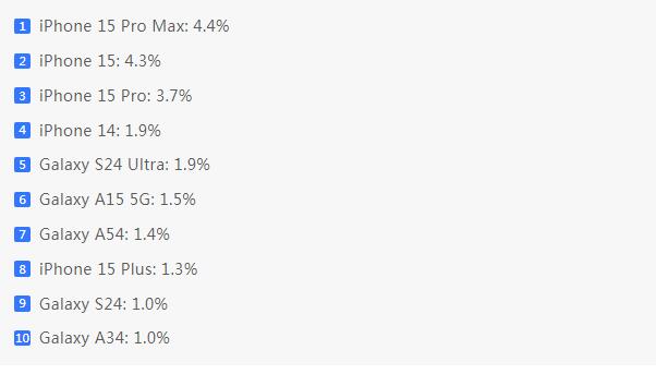 以下是 2024 年第一季度全球最暢銷的10款智能手機以及它們在總銷量中所占百分比: