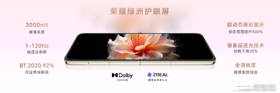 榮耀Magic V Flip的內(nèi)屏表現(xiàn)同樣出色,采用6.8英寸的超清大屏,分辨率達(dá)到2520x1080。內(nèi)屏還支持榮耀綠洲護(hù)眼技術(shù),支持3840Hz超高頻PWM調(diào)光,為用戶提供全天候的護(hù)眼體驗(yàn)。