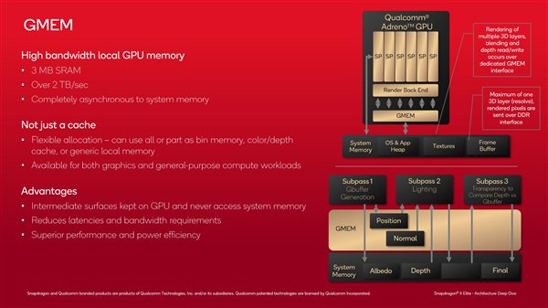 GMEM是個特殊功能單元,也就是高帶寬的本地GPU顯存,容量3MB,帶寬達2TB/s,與系統內存完全異步。