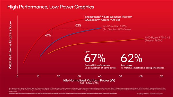 高通聲稱,Adreno X1對比酷睿Ultra的銳炫核顯,同等功耗下性能領先最多67%,同等行下功耗低最多62%!
