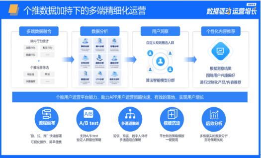 值得一提的是,個推用戶運營平臺不僅沉淀了個推的數(shù)據(jù)能力,還對個推的數(shù)智運營服務(wù)經(jīng)驗進行了產(chǎn)品化。平臺內(nèi)置了豐富的規(guī)則標簽?zāi)0、算法模板以及適用于不同行業(yè)APP的運營策略模板,幫助企業(yè)更加高效的開展數(shù)據(jù)驅(qū)動的精細化運營實踐。同時,平臺也提供流程畫布、A/B test等功能,支持企業(yè)快速、智能地驗證運營策略,并對有效的策略進行一鍵復(fù)用和沉淀,從而持續(xù)升級數(shù)智運營能力,助力企業(yè)用戶增長。