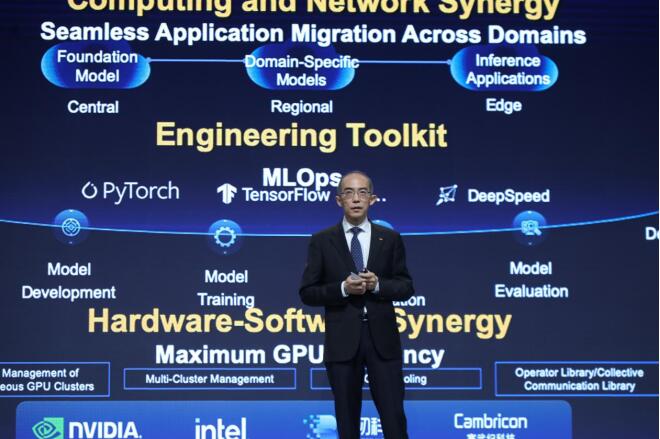 中興通訊倡導構建全棧開放的智算方案。在基礎設施層面,軟硬協同,最大化資源效率。硬件兼容適配國內外主流GPU/CPU,支持OSIA、RoCE/GSE等開放標準的高速無損互聯,為客戶提供多樣化的選擇;軟件支持異構資源管理、訓推作業調度和異構集合通信等,在強化對多廠家GPU支持的同時,為模型運行提供高性能、高可靠的運行環境;通過算力卸載及在網計算等技術,大幅縮減數據讀寫與傳輸時間,提升算力利用率。在能力平臺層面,適配PyTorch、TensorFlow等主流框架,自動實現向后端平臺編譯和優化,并提供從數據處理、模型開發/訓練/優化/評估/部署等端到端的工程工具集,在支持全生命周期保障和管理的同時,還應支持算力原生、混池訓練、高效推理、數據飛輪構建等。在算力網絡層面,強化算網協同,支持應用全域無感遷移。